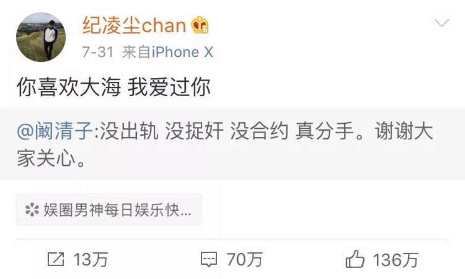 分手和出轨让明星成为了文案鬼才,爱大海的男明星又岂止任豪一个,谁能忘了纪凌尘最出圈的神来一笔呢?