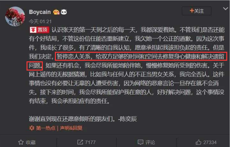 还有一对上过热搜的网红情侣,恋爱综艺里的陈奕辰和张天,分手文案是:暂停恋人关系 。