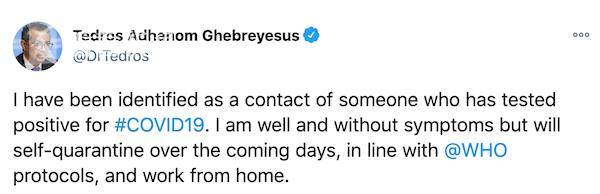 谭德塞在社交媒体上发文表示:“我已经被确定为新冠阳性病例的密切接触者。我状态良好,没有症状,但接下来几天会按照世卫组织的方案自我隔离,居家工作。”