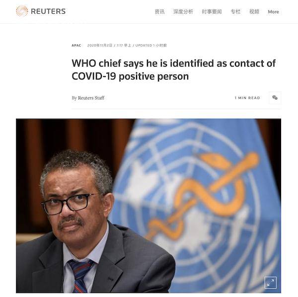 据路透社报道称,世界卫生组织总干事谭德塞被确定为新冠阳性病例的密切接触者。