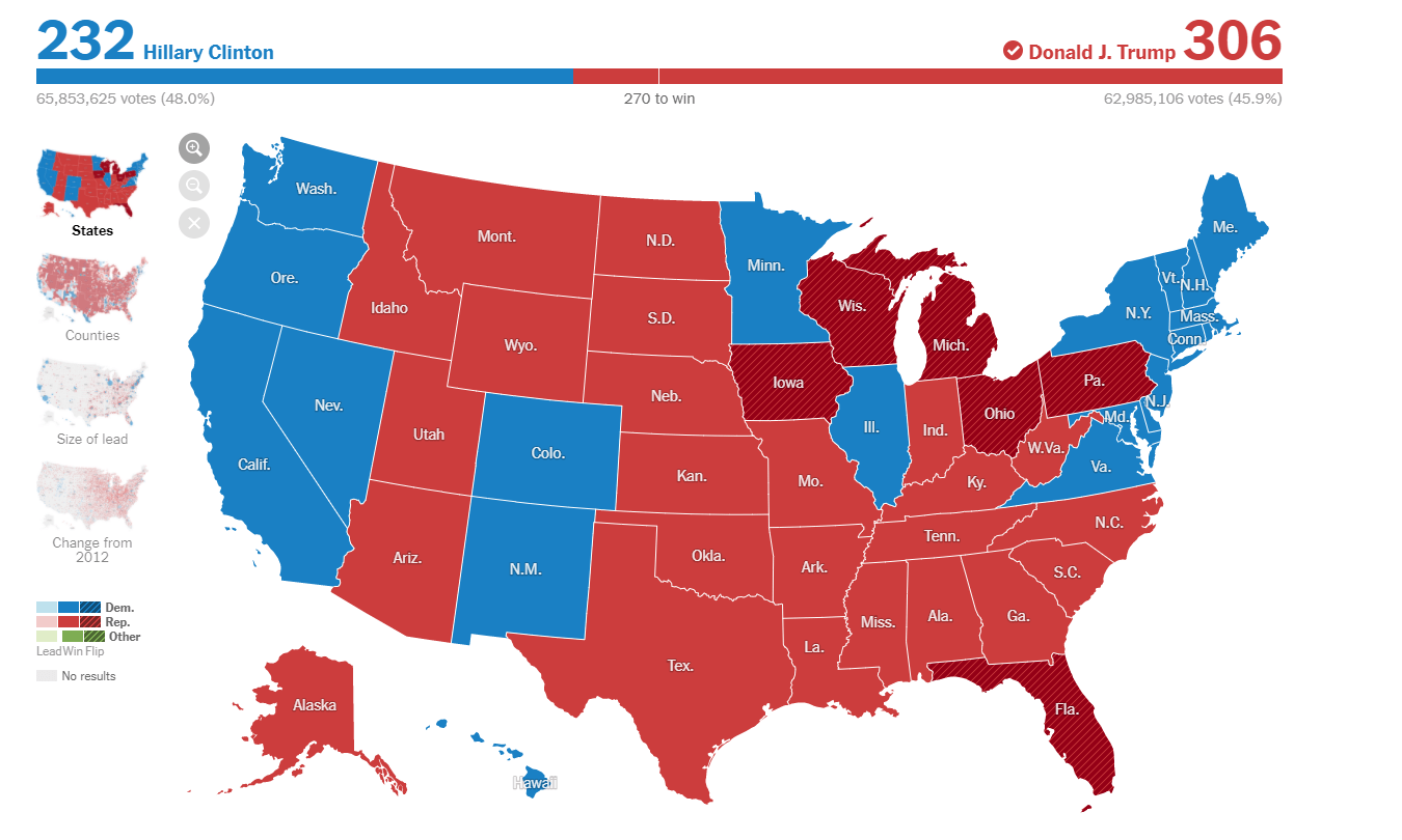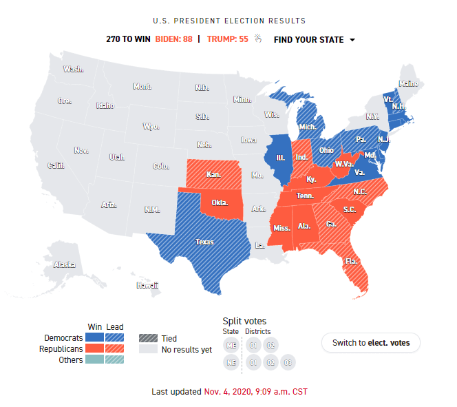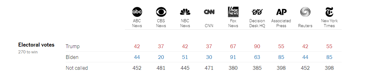 《纽约时报》和美联社计票结果为,拜登85:55领先特朗普。福克斯新闻则显示拜登91:67领先。计票稍慢的CNN和CBS新闻网则显示,特朗普在稍早前领先拜登。