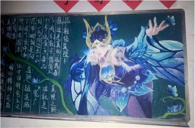 我们来看这位学生画的黑板报上来看,看得出来这位学生一定经常玩“王者荣耀”,他把游戏里边的人物画的简直就像是真的一样,栩栩如生。