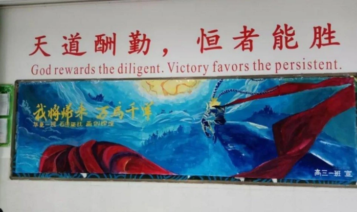 这个黑板报学生画的倒是很有创意,背景是学生们距离高考还有100天的时候,在这个黑板报上可以看得出来“齐天大圣”坐在山头上沉思。