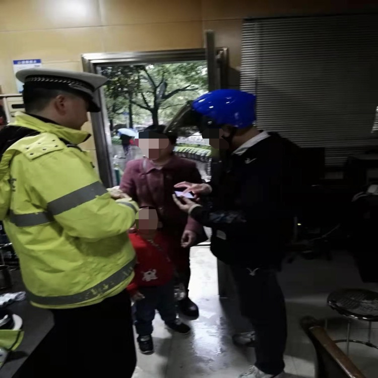 7时45分,刘鹏拦截了一台载了四人的电动车,正当民警要求带其到警务站接受处罚时,驾驶员戴某非常着急:“交警同志,我孩子发高烧了,需要赶紧送去医院接受治疗!”戴某告诉民警,自己虽然载了一大两小,但送儿心切,才冒险上路行驶。