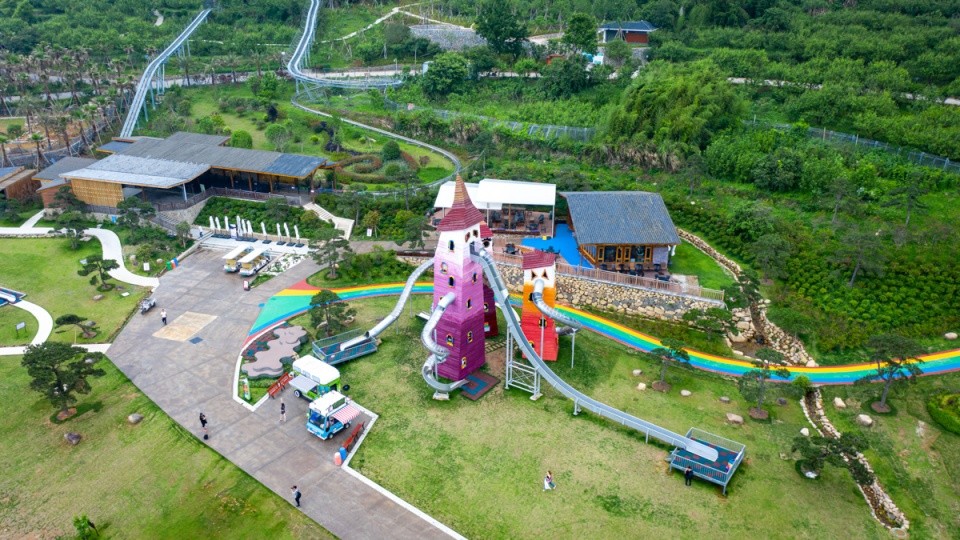 园内现拥有花海溜溜、世界风溜溜、虎溜溜、溜溜塔等66条溜溜滑道。虎溜溜是亚洲最长的滑轨溜溜,全长1620米,也是目前亚洲唯一拥有三立柱盘旋的轨道。过山车大家都玩过,那山地过山车的惊险刺激是来这里最值得体验的项目。滑道穿梭在百花海、百花林、百果园之间,陡坡、弯道的刺激体验让你挑战高度与速度的双重冒险。高达61.8米的溜溜塔也是亚洲最高的溜溜塔。溜溜塔一共有八层,这是一个存在于二次元之外魔法空间,悬挂式AR飞行影院、旋转木马、自由落体、动漫嘉年华、灯光秀、酒吧、球幕影院。在最高160米的溜溜滑梯入口就在最顶层的八楼。