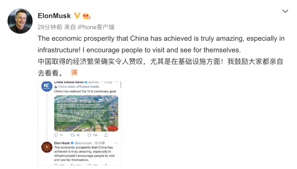北京时间7月1日消息,特斯拉CEO埃隆·马斯克在个人微博@ElonMusk 发文称,“中国取得的经济繁荣确实令人赞叹,尤其是在基础设施方面!我鼓励大家都亲自去看看。”
