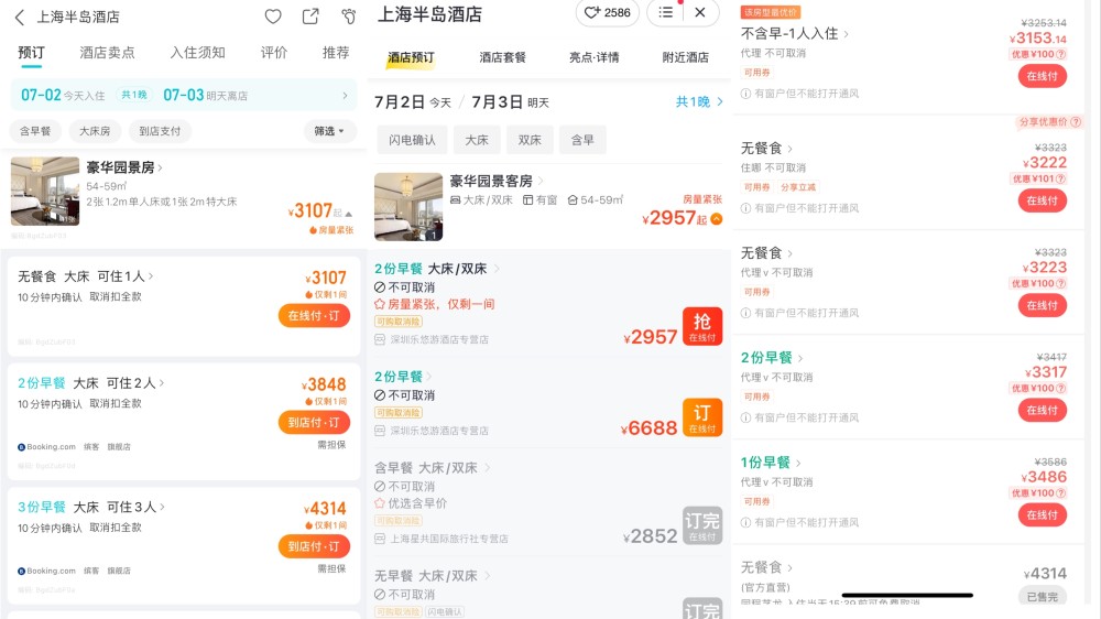 7月2日下午显示的上海半岛酒店豪华园景房预订价格截图,从左至右分别为:官网、美团、携程。