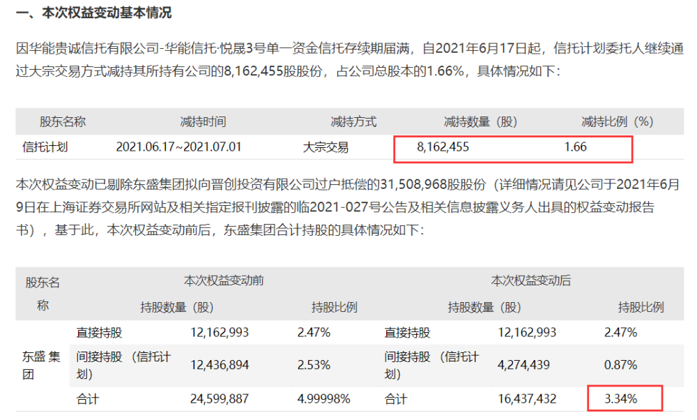 根据公告,因控股股东东盛集团信托计划存续期届满,自2021年6月17日起,信托计划委托人继续通过大宗交易方式减持其所持有公司1.66%股份;权益变动后,东盛集团持股降至3.34%。