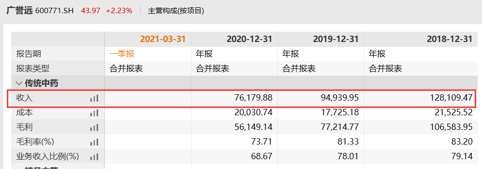 广誉远2020年年报显示,公司传统中药业务当年营业收入为7.62亿元,同比下降19.76%;定坤丹、龟龄集系列产品销售收入较上年同期分别大幅下降了41.54%和38.79%。