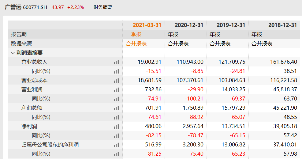 而2021年一季报显示,广誉远一季度营收1.9亿元,同比下滑15.5%,实现净利润517万元,同比大幅下降81%。
