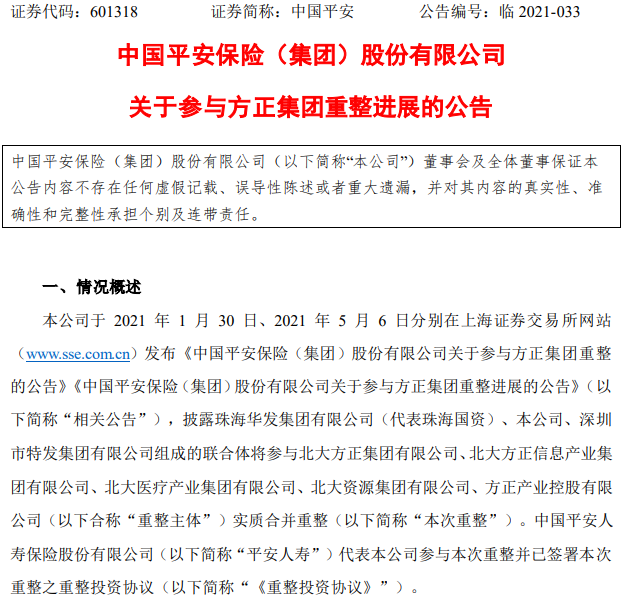 中国平安(02318)参与方正集团重整新进展!