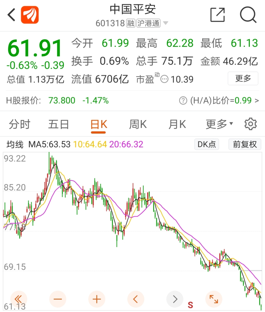 7月5日,A股呈现震荡整理走势,截至5日收盘,沪指涨0.44%,中国平安以下跌0.63%报收61.91元/股。自2020年12月份创下93.22元/股的历史新高以来,中国平安已累计下跌超过33%,大幅跑输大市。