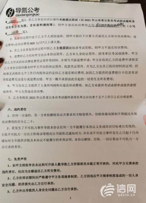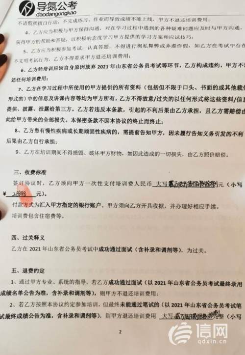 导氮教育青岛分部位于市北区台柳路270号,2020年11月初,王女士在该机构报名了省考立业班,共花费26888元。双方在当天签订了学员协议,“协议上约定笔试没过的话可以退还全部的培训费用。”