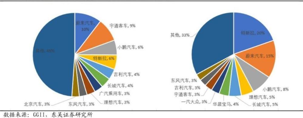 宁德时代装机客户结构(左:2020 年,右:2021 年 1-5 月),图表来源:东吴证券