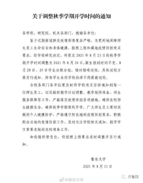 具体到山东,鲁东大学推迟开学时间,将原定8月23日的秋季学期开学时间调整为8月30日,新生报到时间不变。所有学生未经批准不得提前返校。