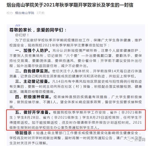 烟台南山学院发布通知:省外(非2021级新生)学生8月28日、省内(非2021级新生)学生8月29日返校报到,任何学生不得提前返校。如不能按期返校,须及时办理请假手续并报告计划返校时间。2021级新生报到时间由学校招生办公室负责通知到学生本人。