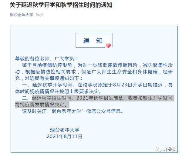 烟台老年大学8月11日在官微发布通知,延迟秋季开学时间。在校学员原定于8月23日开学日期推迟,具体时间视疫情情况并按照上级要求决定。延迟秋季招生时间。2021年秋季招生简章、收费和新生开学时间将视疫情发展情况决定。