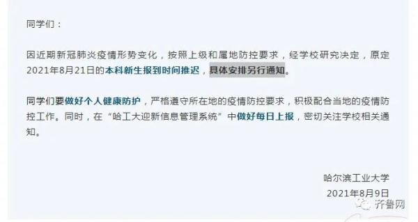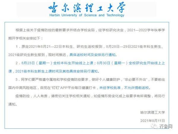 哈尔滨理工大学8月11日发布通知,原定2021年8月21—22日本科生、研究生返校报到,8月28日—29日2021级本科生新生、2021级研究生新生报到,现时间推迟,具体返校时间及安排另行通知。8月23日(星期一)全校本科生开始线上上课;8月30日(星期一)全校研究生开始线上上课,2021级本科生新生上课时间及其他具体安排另行通知。