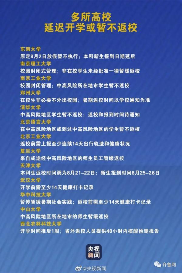 据央视新闻8月5日消息,东南大学、南京理工大学、郑州大学、清华大学等陆续发布秋季延迟开学或中高风险地区学生暂不返校等通知。