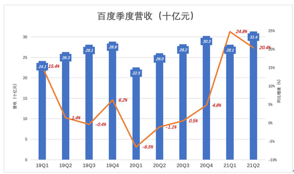 2021年Q2,百度营收创纪录地达到314亿,同比增长20.4%。