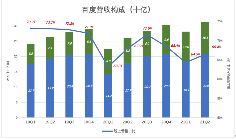 2021年Q2,线上营销收入为208亿,同比增长17.6%,但占总营收的比重从2020年Q2的67.9%降至66.4%。