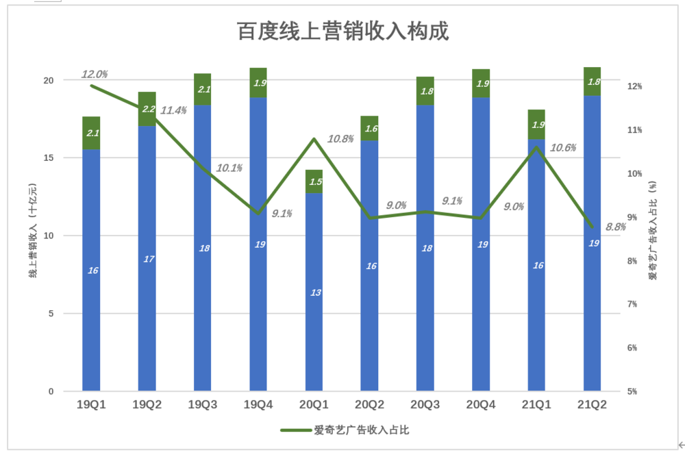 2019年Q1,爱奇艺带来21亿广告收入,占百度此类收入的12%;其余三个季度,爱奇艺广告收入保持在高位,但占比却缓慢下滑。