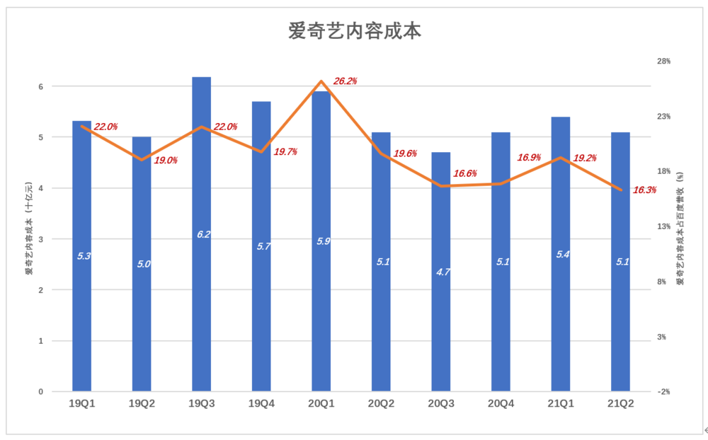 2019年Q1,爱奇艺内容成本达53亿、占到百度营收的22%。2021年Q1,爱奇艺内容成本降至51亿,占百度营收的16%,相差6个百分点。