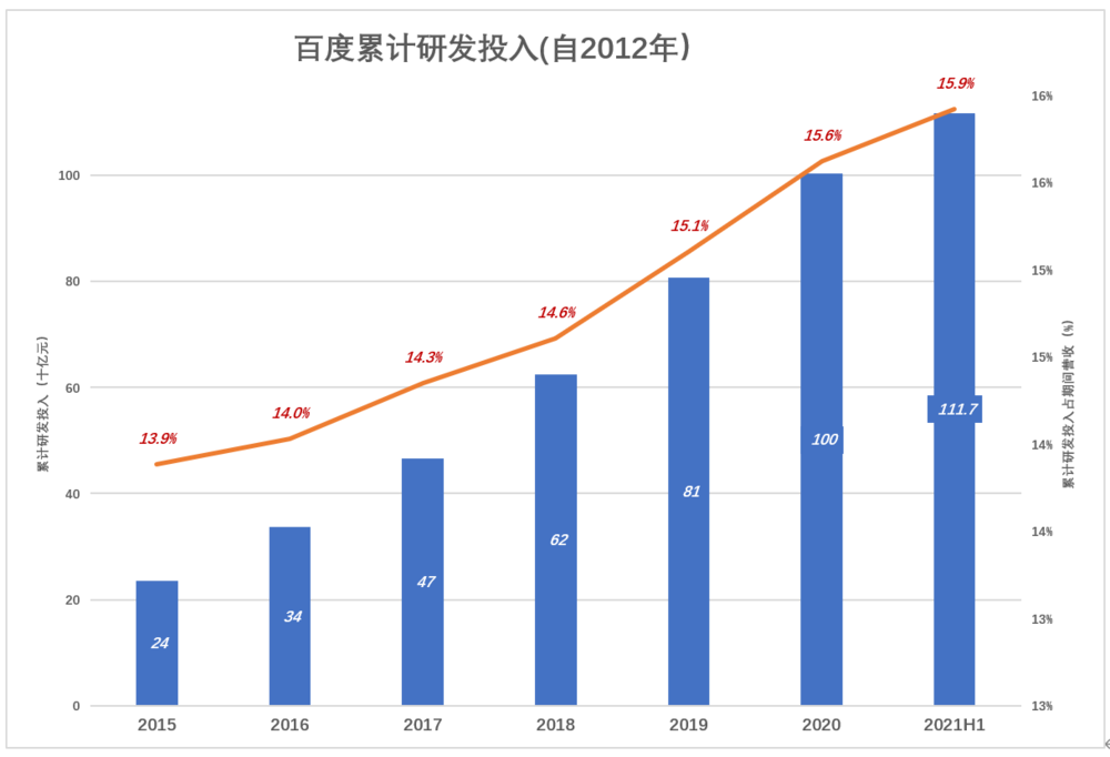 2012年~2015年,百度累计投入研发费用240亿,相当于这4年营收的13.9%;到2020年,累计投入研发费用超过1003亿(自2012年起),占期间营收的15.6%;2021年H1,又投入114亿。