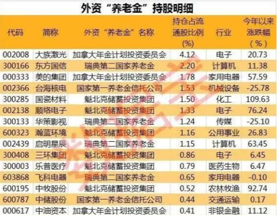 目前在A股持仓比例较大的国外养老金有国家第一养老金信托公司、瑞典第二国家养老金、魁北克储蓄投资集团、加拿大年金计划投资委员会,他们分别持有2家、4家、8家、3家公司的股票,这些养老基金分别属于澳大利亚、瑞典和加拿大的管理规模较大且比较有影响力的投资管理机构。