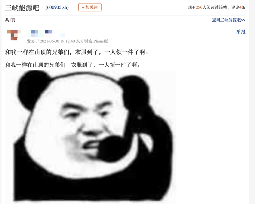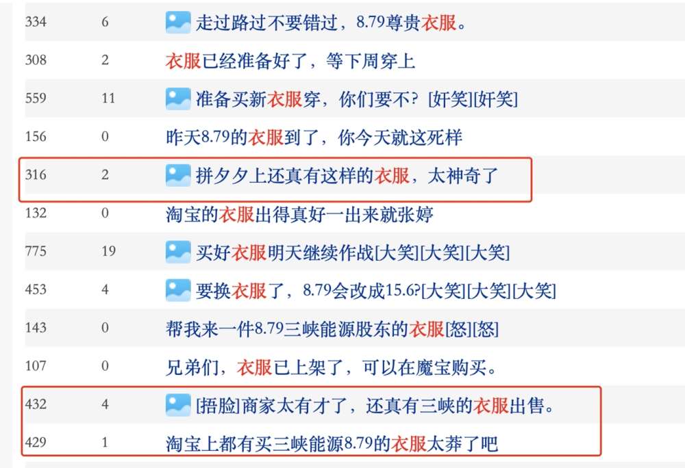 在三峡能源股吧中搜索关键词“衣服”,有89条相关帖子,被“套牢”的股民在里面玩得不亦乐乎,“和我一样在山顶的朋友们,衣服到了,一人领一件。”