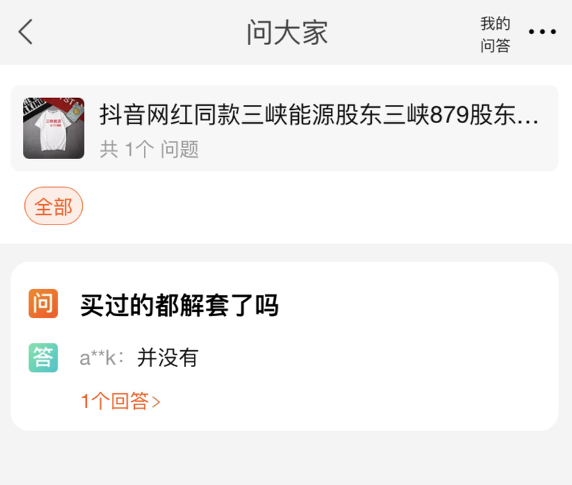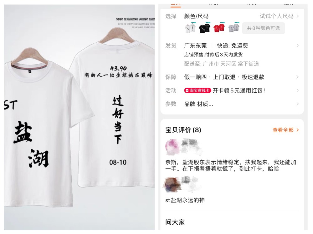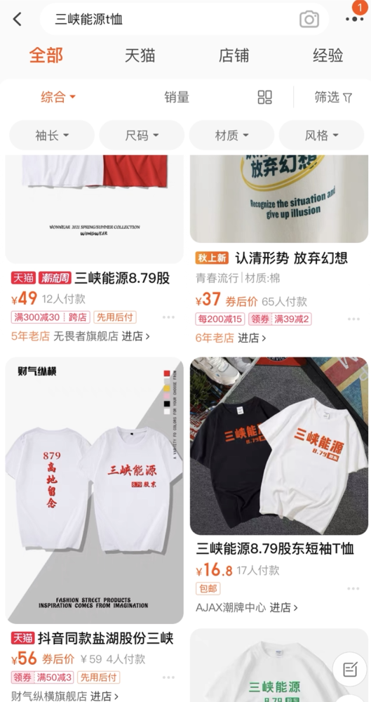与三峡能源有相似股价走势的盐湖股份、中国电信(601728.SH)亦成为股民调侃的对象,淘宝店家也蹭上了这波热度,纷纷上架款式相似的股东T恤。