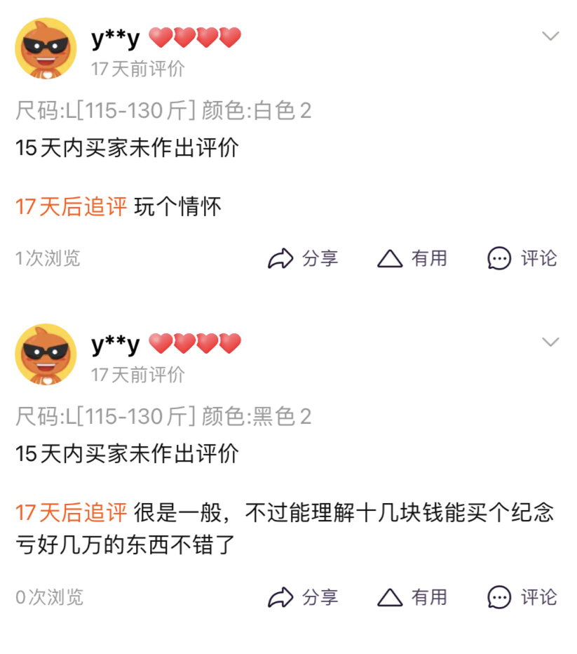更多的买家则是抱着“留念”的心态,有买家收货后发表评论,“十几块钱买来,纪念亏了好几万的东西,也挺好的。”