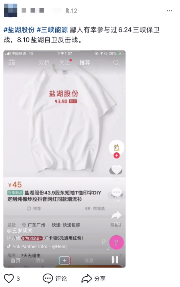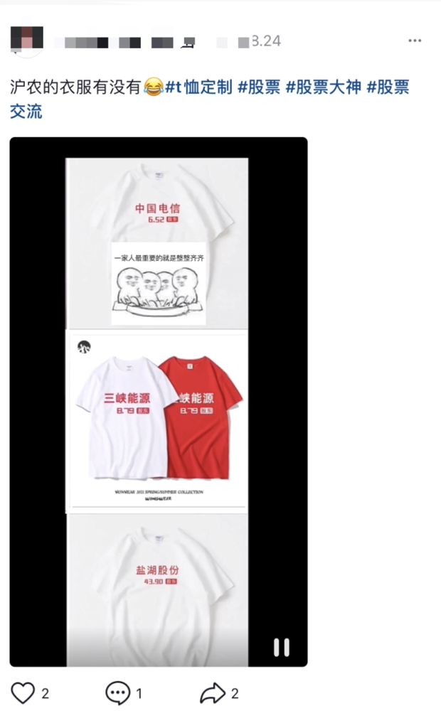 除了三峡能源,股东T恤中的“流行款”还有盐湖股份和中国电信,有投资者凑齐三件T恤,表示“一家人就要整整齐齐”,并喊话“的衣服有没有?”