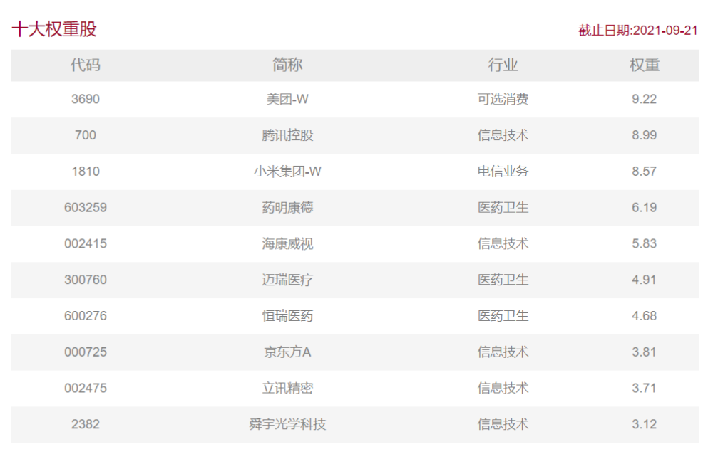 截至9月21日,该指数前十大权重股中,占比第一的权重股为美团、其次为腾讯、小米等。