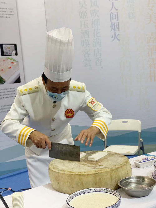 扬州厨师的刀法,独步烹林,文思豆腐是淮扬菜中最能体现刀工的一道汤菜。在美食展区,有“文思豆腐第一人”之称的中国淮扬菜大师程发银现场表演了切文思豆腐后,还用高汤现场制作了文思豆腐羹,吸引了不少观展者驻足等候尝鲜。
