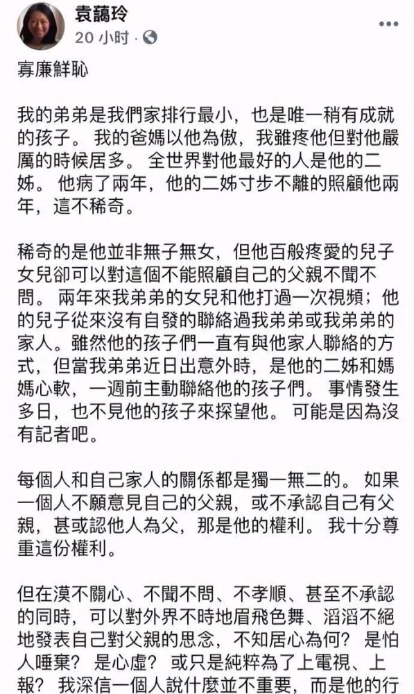 2018年,袁惟仁突发脑溢血入院,之后他姐姐曾公开发文手撕袁惟仁前妻陆元琪,指责对方没有教育好小孩,儿女都不来探望病重的父亲。