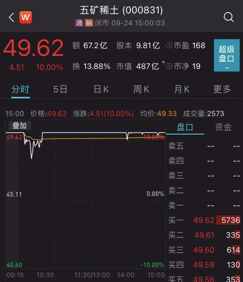 受此影响,截至9月24日收盘,五矿稀土报收于49.62元/股,上涨10%,成交额达67.16亿元。中国稀土行业协会数据显示,9月24日,稀土价格指数为252.1点,较去年5月6日的129.5点,几乎翻一番。