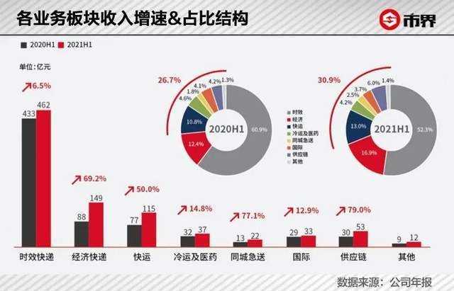 所以,回归正常之后,顺丰的问题也回来了。2021年上半年,顺丰营收中,时效快递增速又回到了6.5%。
