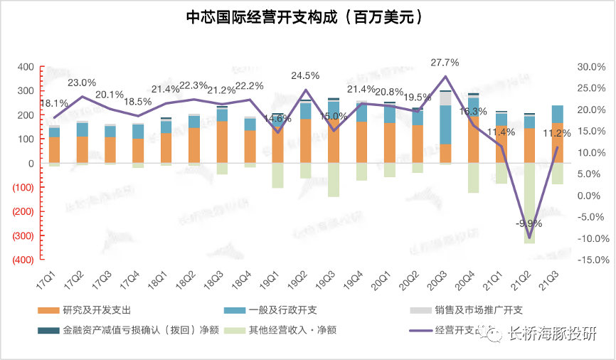 从经营开支角度看,三季度中芯国际经营开支是1.58亿美元。继上季度经营开支为“负”后,数据再次恢复正常。上季度的“非常规”表现,主要由于资产处置收益等影响。
