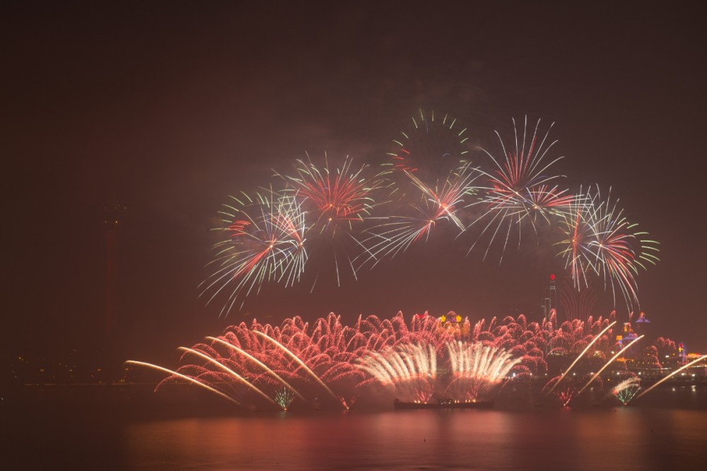 2019年12月22日当晚,澳门与珠海首次联合举行烟花汇演,庆祝澳门回归祖国20周年。新华社记者 张金加 摄