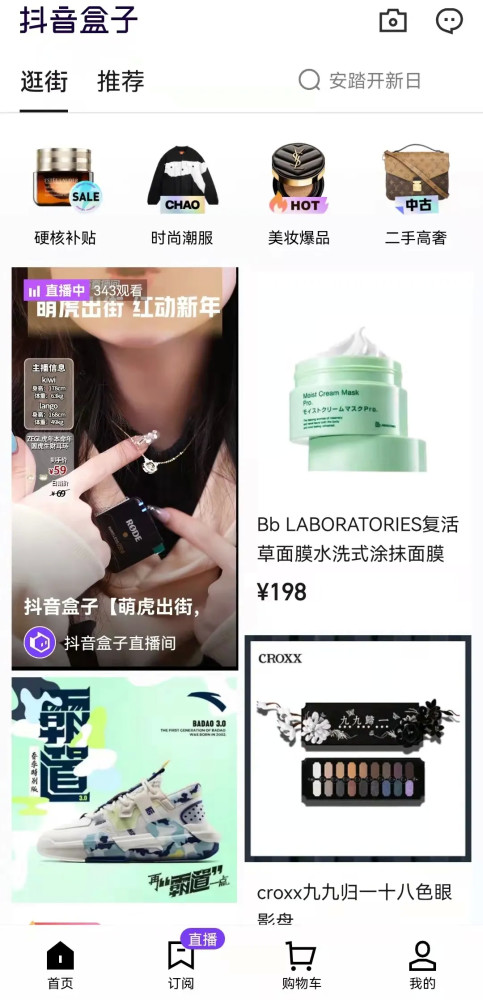 抖音盒子首页分为“逛街”和“推荐”两个界面,其中“逛街”设置四个不同品类的入口,包括硬核补贴、时尚潮服、美妆爆品和二手高奢。往下滑是直播间和双列产品展示,数据与抖音APP同步。相比抖音目前接入淘宝外链,抖音盒子更聚焦在抖品牌和抖店的运营。