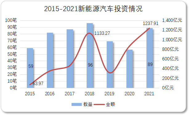 数据显示,去年全年新能源汽车共发生89起融资,这是继2018年以来次高。而融资规模上,从已披露具体金额的情况看,投融资规模已创下历年新高,2021年总额至少在1237亿元以上