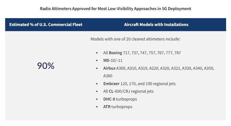 截至 1 月 20 日,FAA 已经允许 90% 的美国商业机队在部署了 C 波频段的机场进行低能见度着陆,其中包括波音 737、747、787、空客 319、320、330、380 等机型,希望这事最终能迎来各方都满意的结局吧。