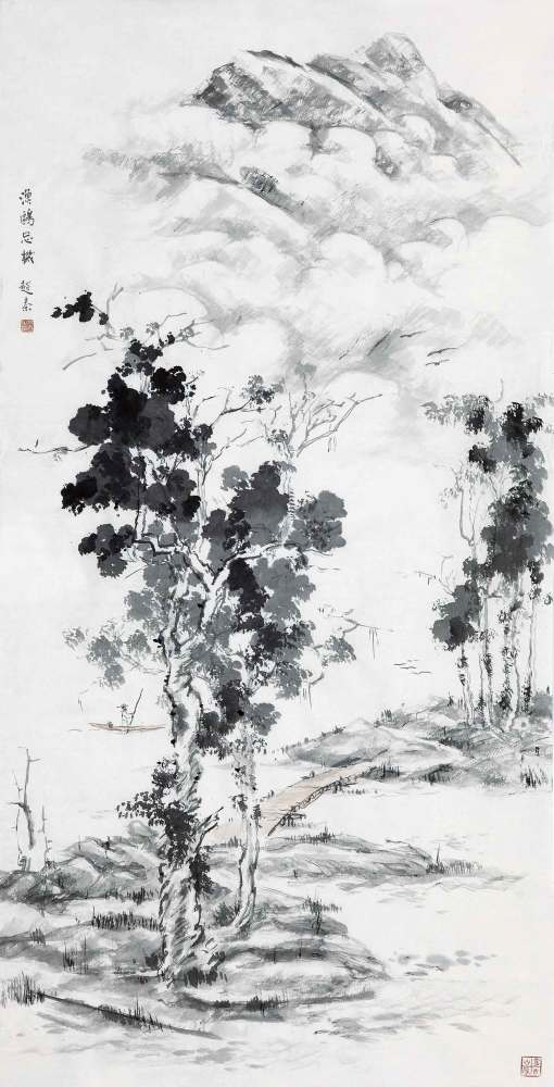 赵秦的作品使我们找回了文人画的感觉。说起江南,难免不说空灵通透,赵秦的画就是如此,是遗传还是修炼,恐怕两者都有,后者更多一些。修炼既有修养和阅读,也有文化的薰陶,也有静心的捉摸和内功的苦练。古人是乐山乐水而画山水,赵秦则是想山想水而画山水,他的画为都市的嘈杂提供了一种向往,实际上也是他自己的向往。山水被他理想化了,这种理想化不是太虚幻境,而是现实的离我们远去的自然。赵秦笔墨疏淡,意境幽深,有古人遗风,但仔细看去,似乎又都是实景实情,古人的笔墨被他转化为现实的场景,但都小心地掩盖起来,岁月苍桑,江山早不依旧,画面尽管清新,隐约却是深深的叹息。