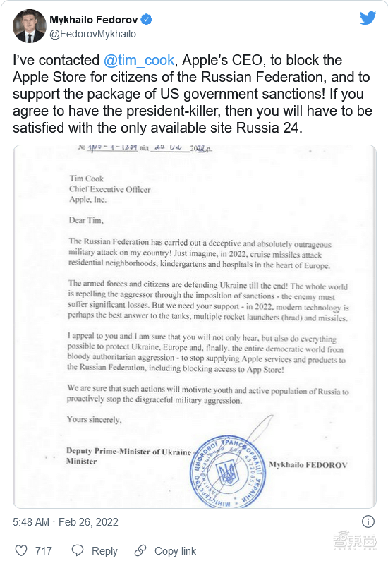 比如,2月26日,乌克兰副总理米哈伊洛·费多罗夫(Mykhailo Fedorov)在推特上发布了给苹果公司首席执行官蒂姆·库克的一封信,声情并茂地请求,苹果公司应该支持美国在俄罗斯对乌克兰采取军事行动后对该国实施的制裁。