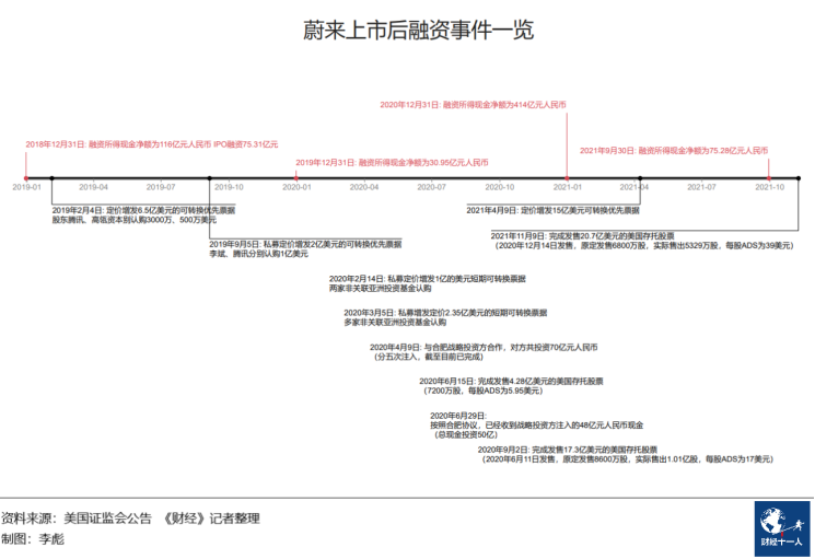 新造车是众所周知的“‘烧钱游戏”。为了缓解资金压力,蔚来在2019年—2021年共完成了9次融资,方式包括可转换票据、存托股、战略投资,按最新的美元汇率计算,总计金额至少412亿元。