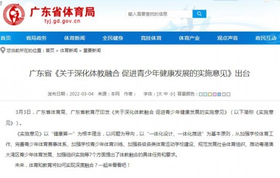 广东省体育局副局长林瑛表示,早在2020年年底,体育和教育部门就联合启动了《意见》的编写工作,经过12次研讨会、专家组深入调研论证和向社会广泛征求意见后最终成文。