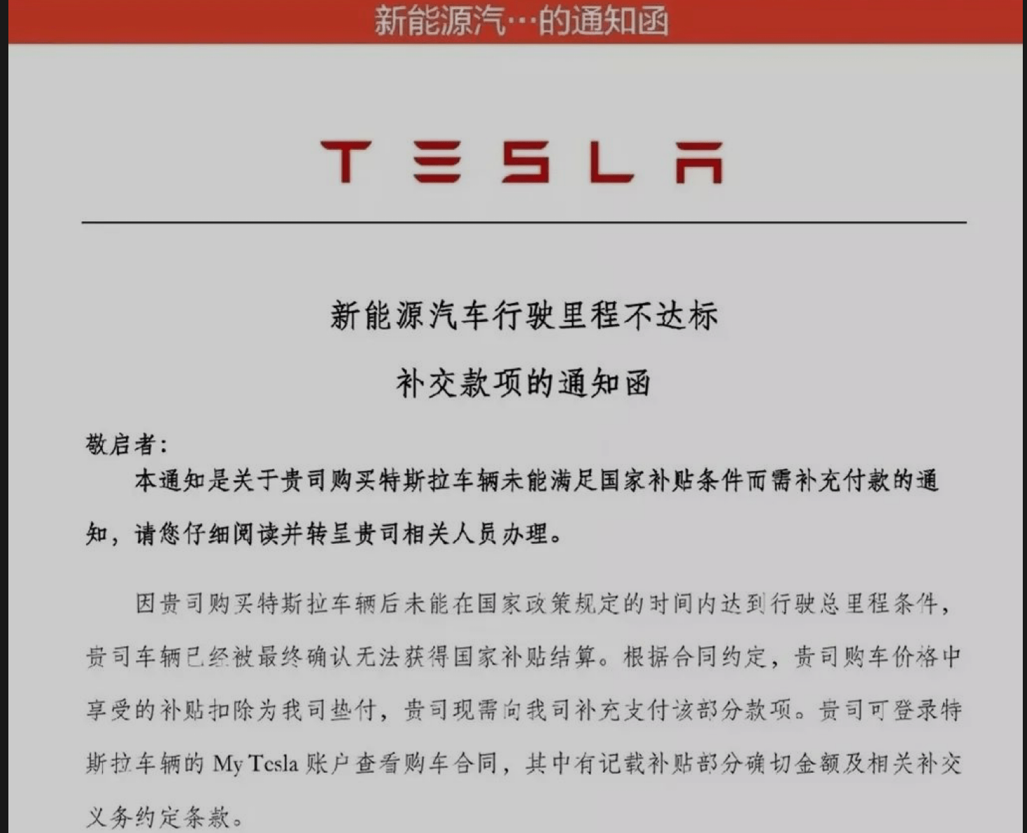 由于购车的价格已是厂家垫付补贴后的价格,因此特斯拉向未达标车辆所属的用户发出了催款函件。