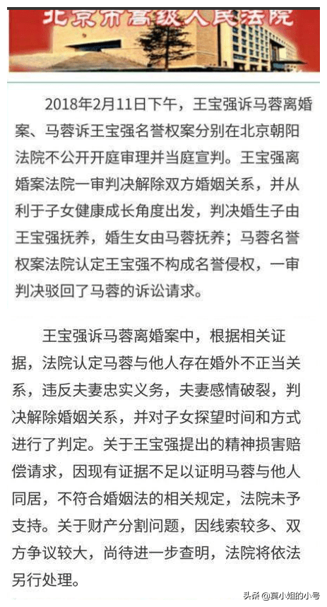 经过两年多的相互撕逼,法院终于做出了判决。马蓉拿了王的一部分资产,取得了女儿的抚养权,儿子的抚养权归了王。