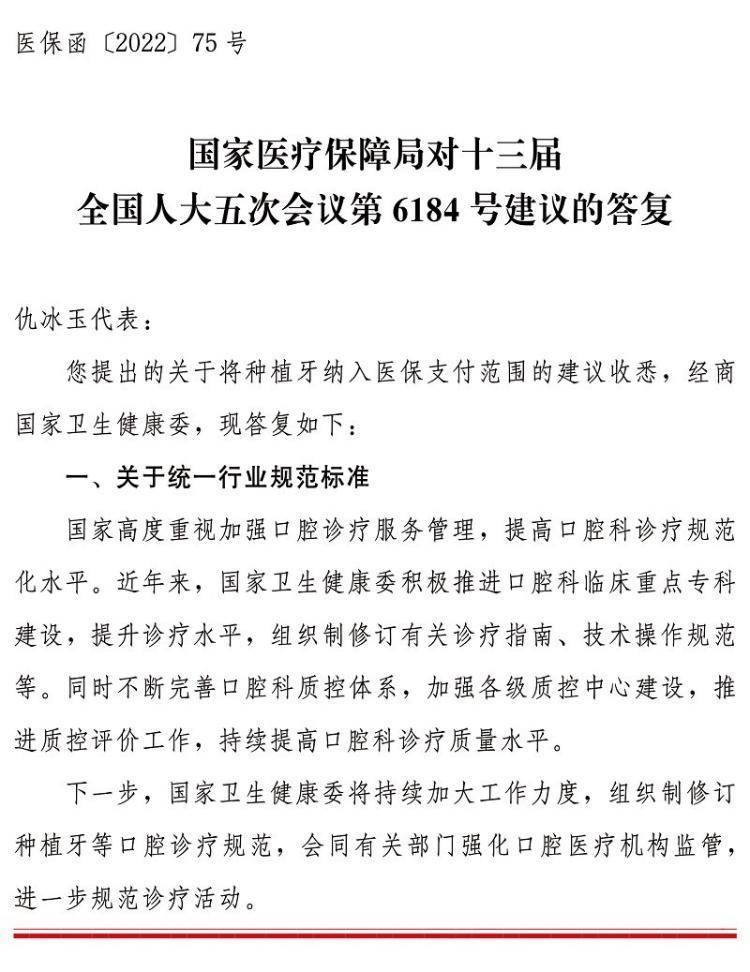 日前,国家医疗保障局发布对十三届全国人大五次会议第6184号建议的答复,针对将种植牙纳入医保支付范围的建议给出相关答复。